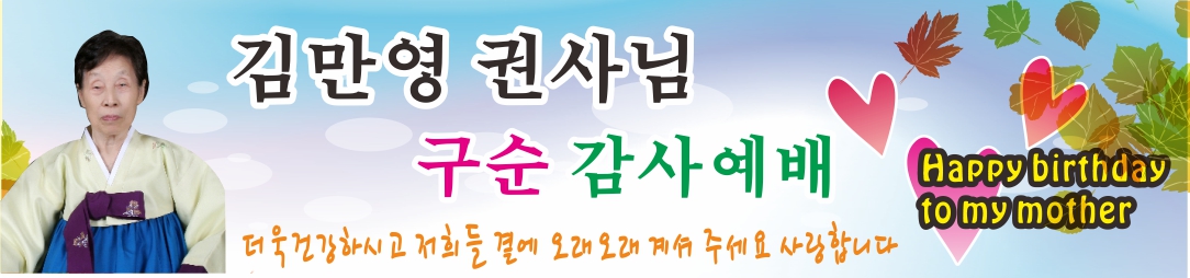 사진 수정 감사합니다. 마지막으로 현수막 밑에 글씨 수정 부탁드립니다. 1. "~~~~사랑합니다." 옆에 "!!" 2개만 넣어주세요 => 사랑합니다 !! 2.글자수가 많아서 이 글씨체로 하신 것 같은데 잘 읽혀지지가 않네요 좀 다른 글자체면 해주시면 안될까요 3. 내일 오전에 찾겠습니다. 끈과 구멍은 필요없구요 가격은 문자로 알려주세요^^ ** 일을 잘해주셔서 계속 찾을 것을 같습니다. 감사합니다.