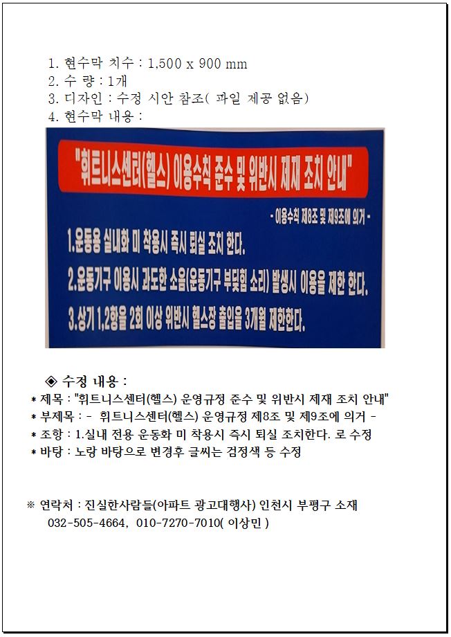 현수막내용: "휘트니스센터(헬스) 이용수틱 준수 및 위반시 제재 조치 안내"