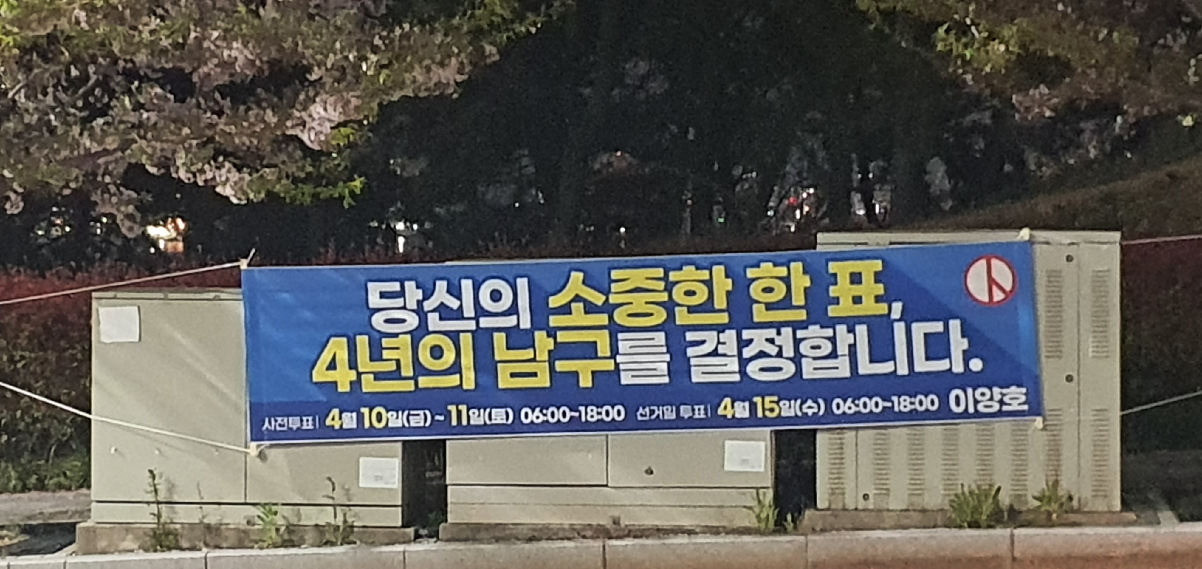현수막내용: 소중한 6한표 4면의 남구를 결정합니다. 사전투표 4월 10일(금)~11일(토)06:00~18:000 선거일투표 4월 15일(수)06:00:18:00 김승덕